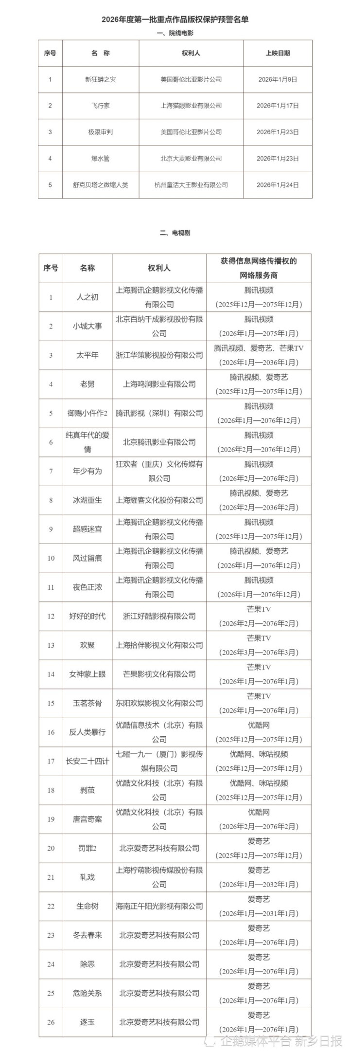 按照国家版权局《关于开展院线电影版权保护专项工作的通知》《关于进一步加强互联网传播作品版权监管工作的意见》及版权重点监管工作计划,根据相关权利人上报的作品授权情况,现公布2026年度第一批重点作品版权保护预警名单。
