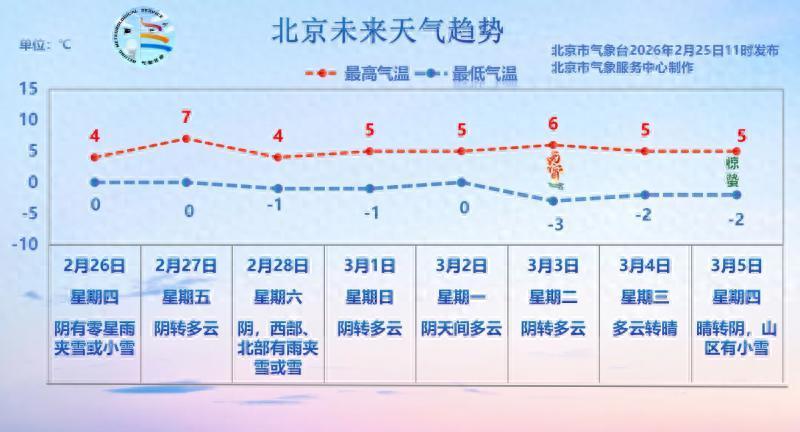 今天(2月25日)北京大部分时间天空阴沉,白天有零星雨夹雪,最高气温7℃。夜间到明天白天平原地区有间歇性小雨夹雪(山区小雪),受此影响,明天最高气温有所下降,仅有4℃。到了明天夜间转为小雪或零星小雪,总体降水量不大。